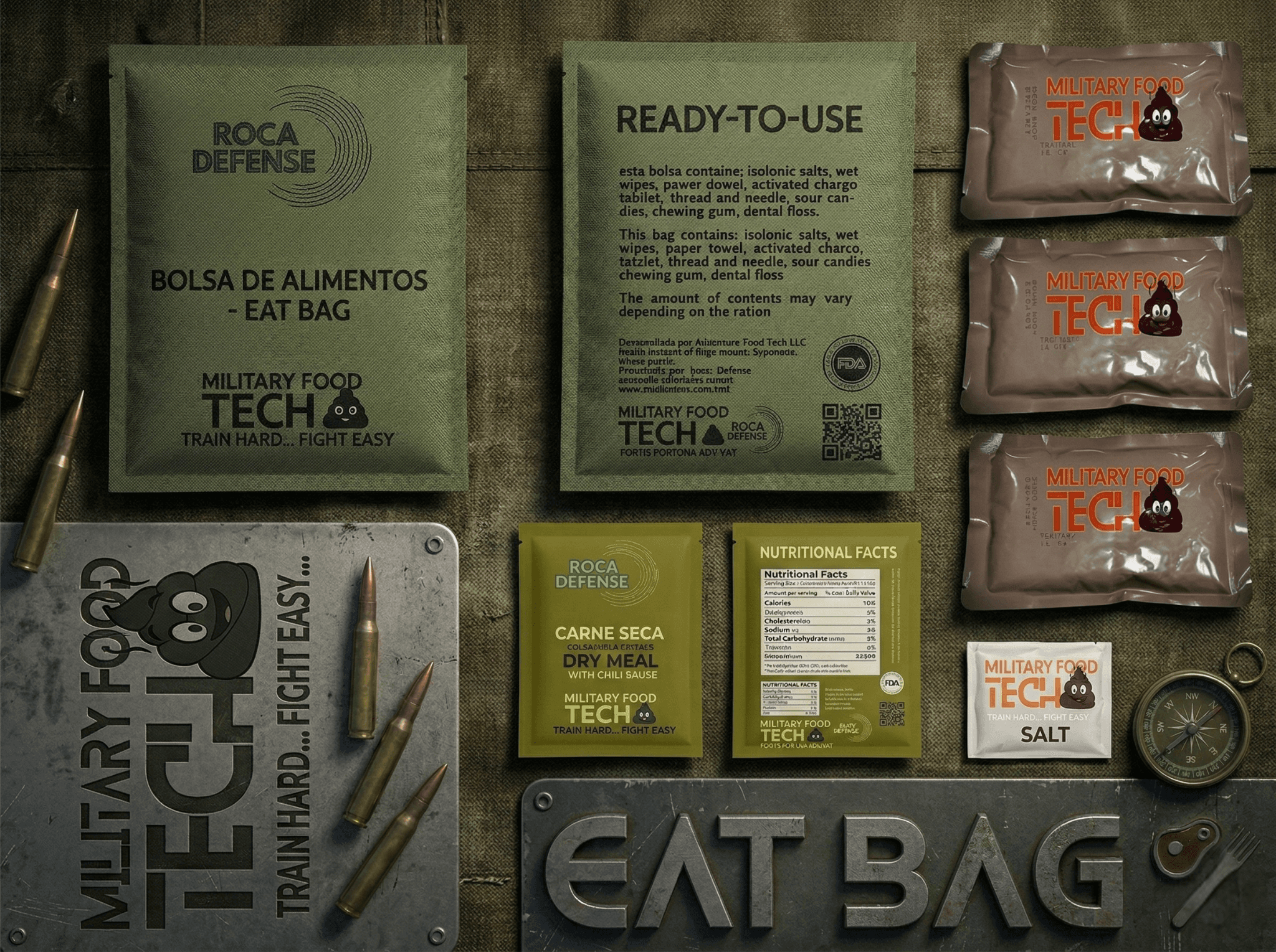 Military Food Tech, es nuestra división especializada en alimentación de emergencia para 72hs (con enfoque en las necesidades calóricas dependiendo el entorno geográfico, Jungla, Acuática, Desierto, Alta Montaña, Zona Fria, Urbana, Etc) y de 24hs (con enfoque en las necesidades calóricas dependiendo el tipo de misión de alto impacto: Aerotransportada, Acuática, Terrestre)
