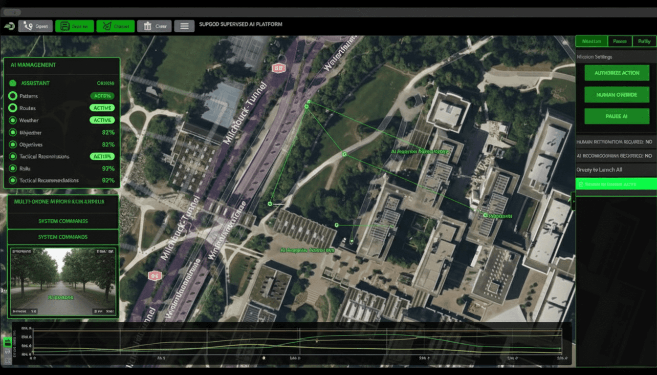 Cada dron posee un asistente de IA supervisada que no actúa sin autorización humana. La IA analiza patrones, rutas, clima, objetivos, riesgos y recomendaciones tácticas. El operador mantiene control absoluto.