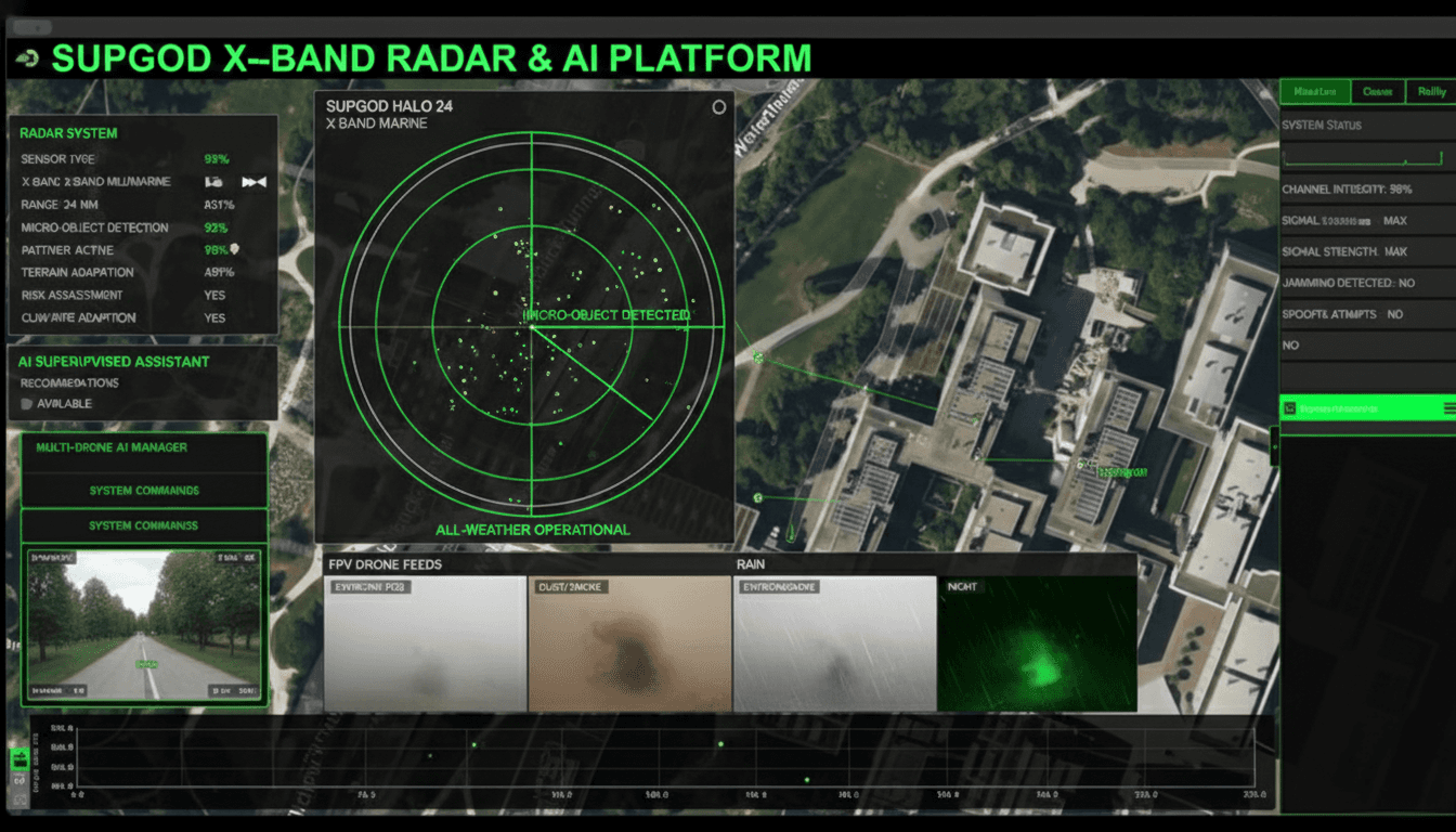 SUPGOD reemplaza LiDAR con radar marino/militar X Band, permitiendo operación en niebla, lluvia, polvo, humo y baja visibilidad. Detecta microobjetos, interpreta clima y terreno, y ofrece seguridad operacional en entornos complejos como fronteras, costa, montaña o agro nocturno